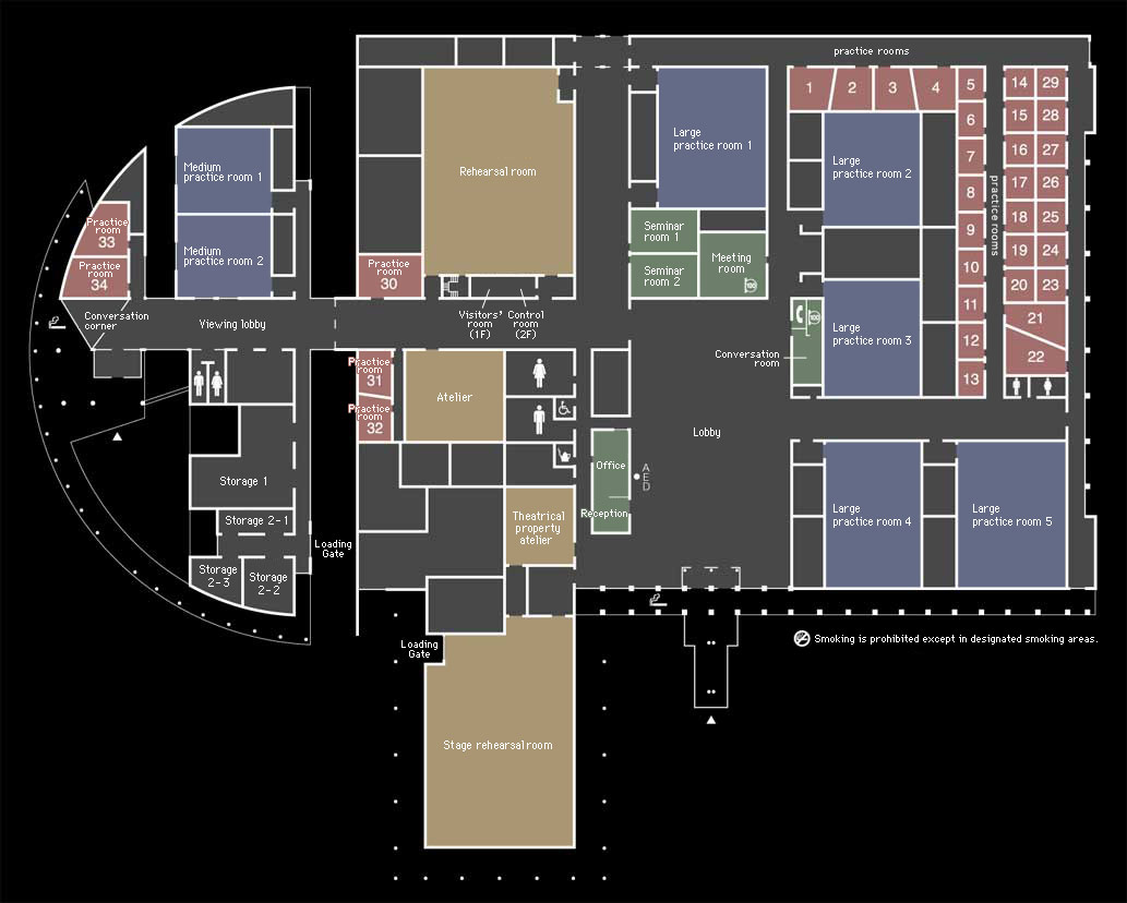 4 rooms are equipped with amplifiers and drum sets for pop band practices and 30 rooms are equipped with pianos. For a better acoustic environment, rooms are arranged so that no opposing wall faces parallel.
